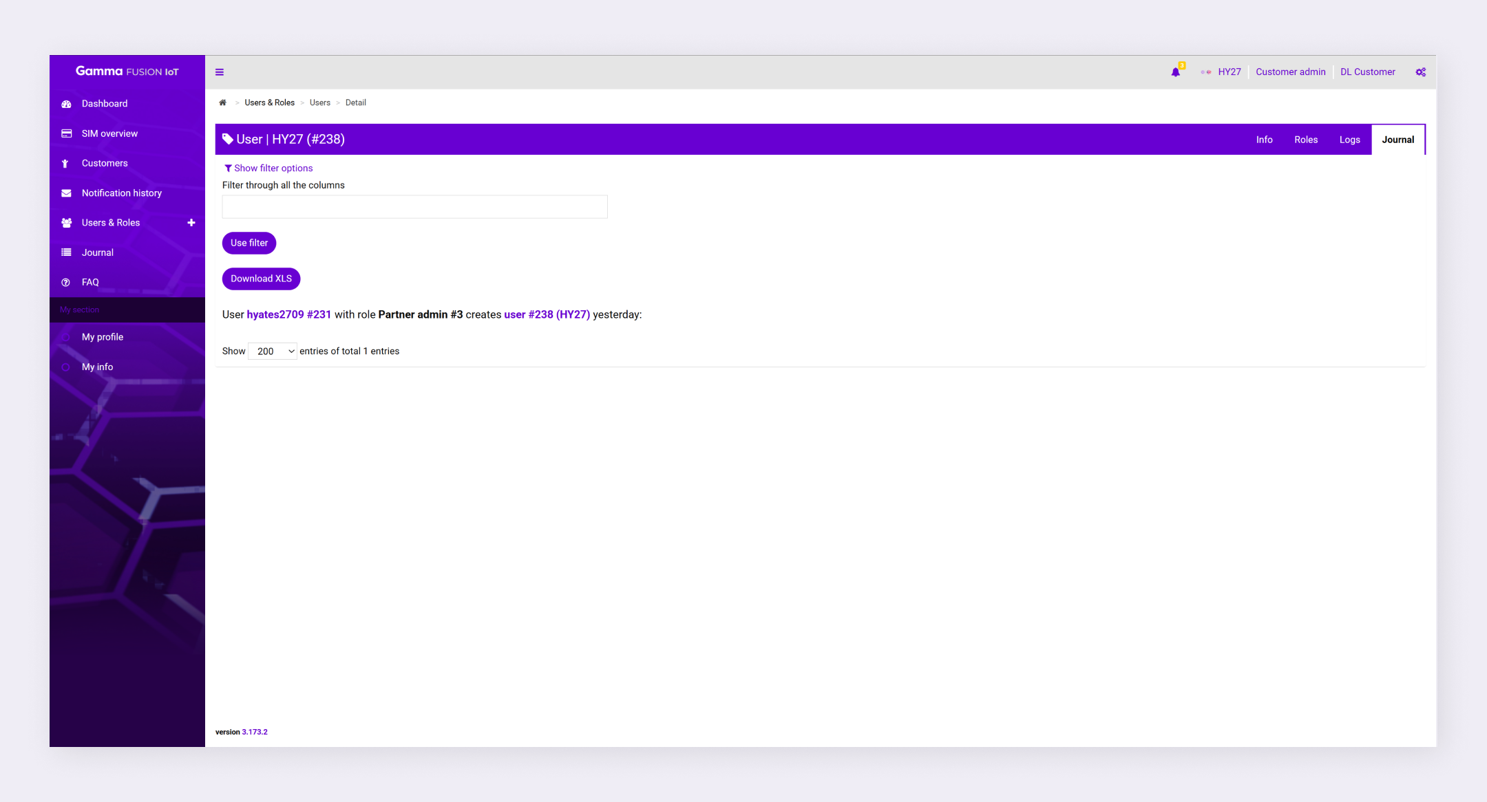 The user journal contains a list of activity associated with the selected user. You can use filters to find specific activity and export an XLS file for further investigation.