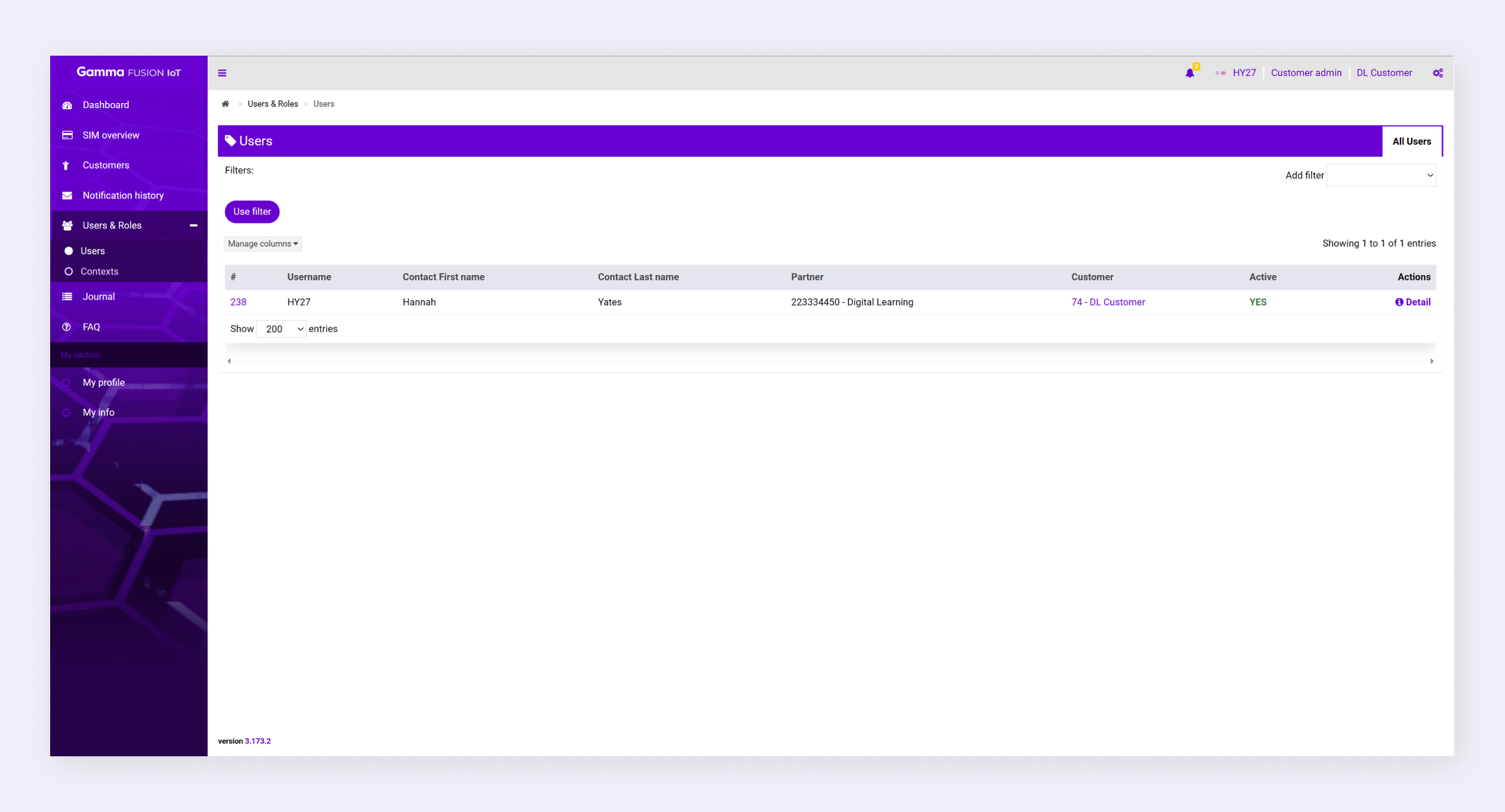 Customer admins can view all users associated with the customer account in the Users & Roles area of the portal.